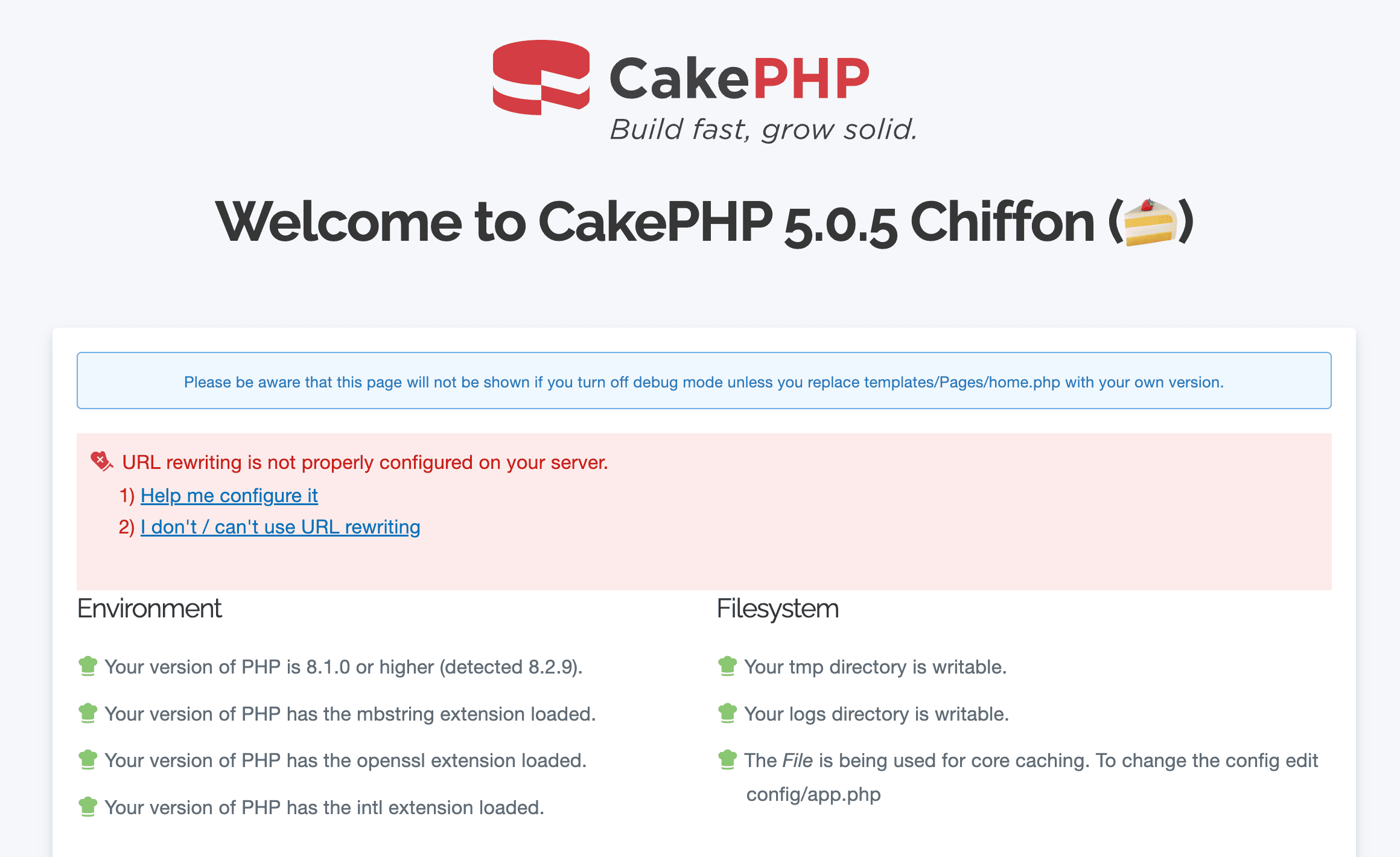 ちなみにCakePHP5はPHPのバージョンが8.1以上でないと動かないので、サーバーやローカル環境のPHPが8.0以下ならまずPHPのバージョンアップをしろって言わるので注意してください。
